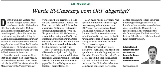 Der ORF will den Vertrag mit seinem langjährigen Korrespondenten Karim El-Gawhary offenbar nicht über den 30. Juni 2026 hinaus verlängern. Just zu einem Zeitpunkt, da er für seine Berichterstattung über den Krieg in Gaza in sozialen Netzwerken und in einzelnen Stellungnahmen massiv angefeindet wird. Einer der Vorwürfe dabei lautet: El-Gawhary spreche über Israel als Besatzer und über die Palästinenser als Besetzte.